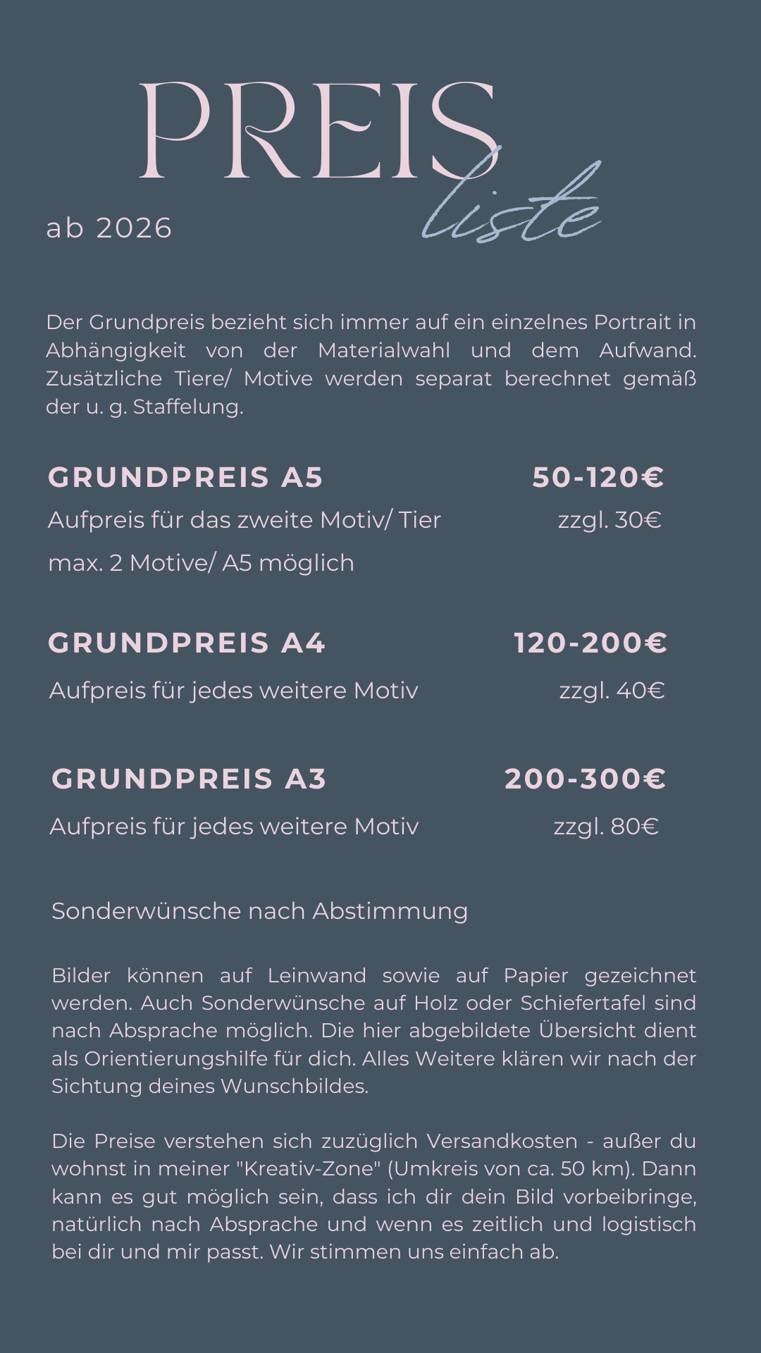 Du möchtest gern ein Bild gezeichnet bekommen, aber es soll kein klassisches Tierportrait sein? Schreib mir einfach gern und wir schauen, was machbar ist. In meiner Galerie findest du ein paar Impressionen anderer Bilder.